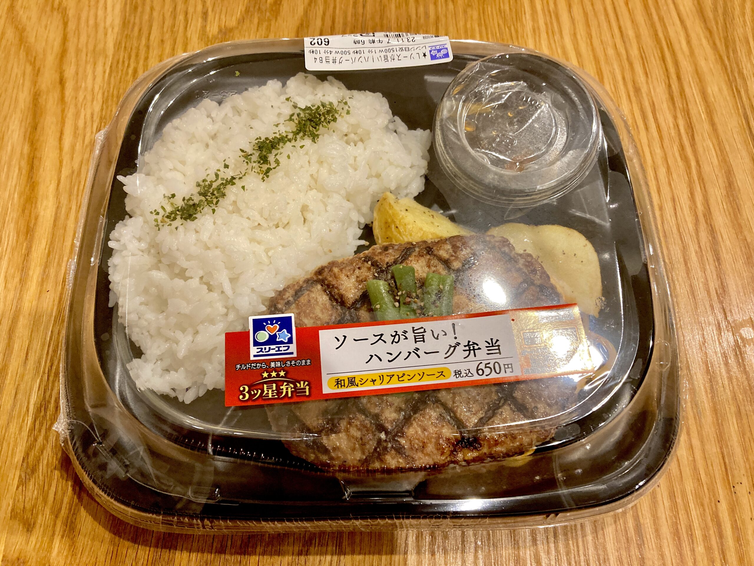 お名前は「ソースが旨い!ハンバーグ弁当」。その名の通りソースもおいしいです。シャリアピンソース?って聞いたことが無いので調べたら、日本で生まれたソースみたいです。簡単に言うと醤油ベースの玉ねぎソースです!!ソースもさることながらハンバーグもめちゃくちゃ美味しくて、もしハンバーグ屋さんでこれを出されたら「やっぱり専門店の味だね!」ってなってしまうほどです。口の中でハンバーグの解け具合も良くシャリアピンソースとお肉がマッチしてもう10月は週一で食べてたぐらいでした。添えてあるインゲン、スライスガーリック、ポテトも箸休めにちょうど良しです!