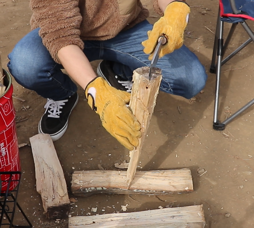 薪を割る時にも手をケガしないために手袋は必要です。焚き火グローブは厚みもあり作りがしっかりしているので、手を守ってくれます。