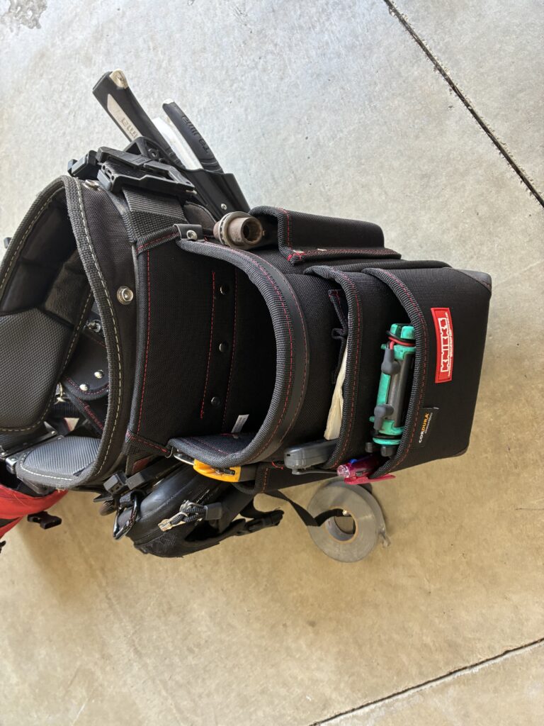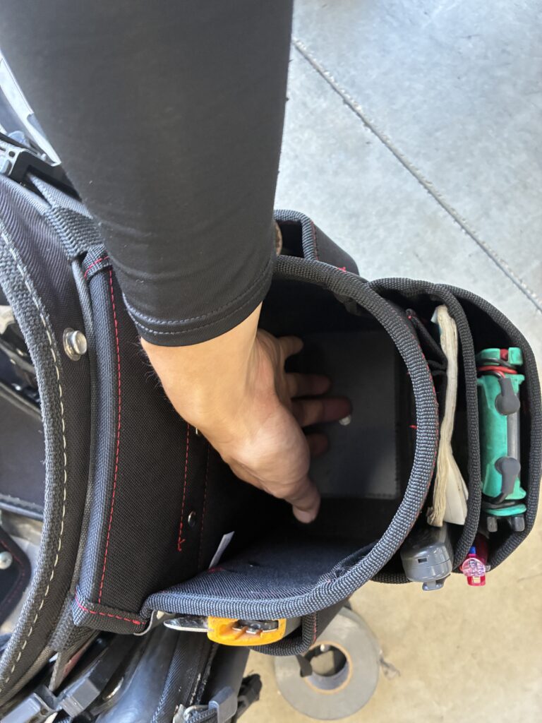 1段目のメインは何も入れず、2段目に水平器、検電器、メモ帳 3段目はテスター、右ポケット4口ラチェット、左ポケットはカッターを備えています。